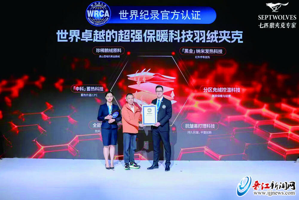 活动当天,WRCA世界纪录认证官马克西姆为七匹狼商旅多彩科技羽绒夹克颁发世界级荣誉——“世界卓越的超强保暖科技羽绒夹克”WRCA世界纪录认证。该荣誉不仅是对七匹狼科技创新能力的高度认可,也是中国男装在功能性服装领域实现突破的重要标志。