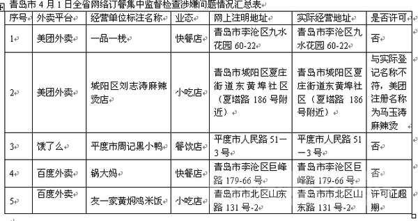 青岛市4月1日全省网络订餐集中监督检查涉嫌问题情况汇总表