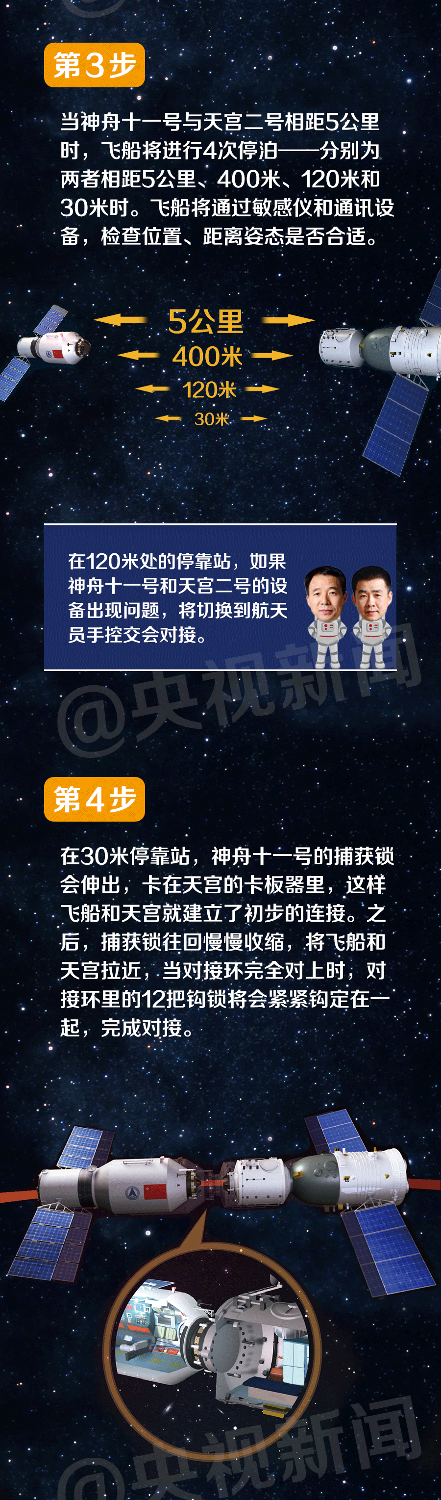 自动交会对接实施期间,航天员景海鹏、陈冬在神舟十一号飞船返回舱值守,密切监视着飞船仪表盘上的各类数据和对接过程,认真执行各种指令发送操作,并通过天地通信系统,迅速准确地向地面报告交会对接实施情况。