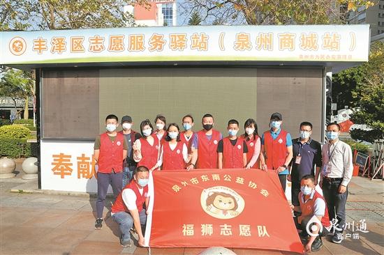 在泉州商城广场志愿驿站,一面印制有卡通“福狮”造型的鲜艳队旗迎风招展。当天,泉州市东南公益协会将其防疫志愿队命名为福狮志愿队。