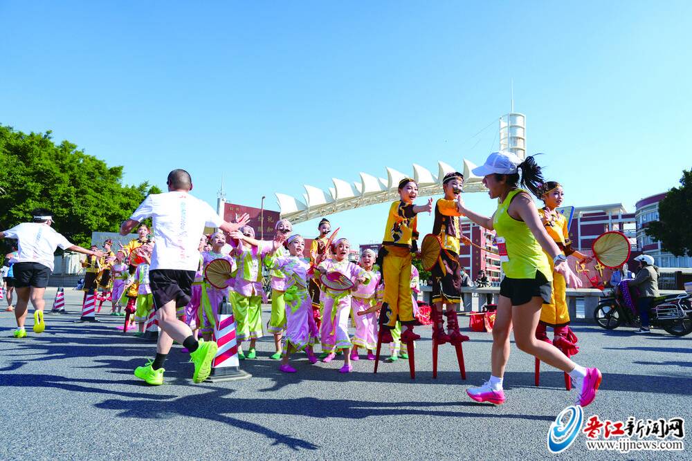 除了激昂的特步鼓阵,赛事组委会与安海镇还在赛道沿线精心集结了多支“氛围担当”表演团,让千年古镇的文脉底蕴与运动激情碰撞交融。表演队伍中,既有国家级非物质文化遗产——安海嗦啰嗹特色展演,也有活力四射的歌手驻唱,舞狮腾跃,高跷灵动,火鼎公婆诙谐逗趣,还有节奏感十足的节令鼓、元气满满的啦啦操。丰富多彩的节目轮番上演,展现安海古镇朝气蓬勃、多彩多姿的文化魅力。
